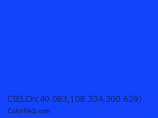 CIELCh 40.083,108.334,300.629 Color is a normal blue color and the nearest color is Blue RYB #0247fe. Hex code #1344fc and RGB value is rgb(19,68,252). In RGB color space, this color is composed of 7% red, 27% green, 99% blue, In CMYK color space, this color is composed of 92% cyan, 73% magenta, 0% yellow , 1% black , In HSL color space, this color has a hue angle of 227° , 97% saturation and 53% lightness.