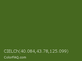 CIELCh 40.084,43.78,125.099 Color is a dark green color and the nearest color is Dark Moss Green #4a5d23. Hex code #46681f and RGB value is rgb(70,104,31). In RGB color space, this color is composed of 27% red, 41% green, 12% blue, In CMYK color space, this color is composed of 33% cyan, 0% magenta, 70% yellow , 59% black , In HSL color space, this color has a hue angle of 88° , 54% saturation and 26% lightness.