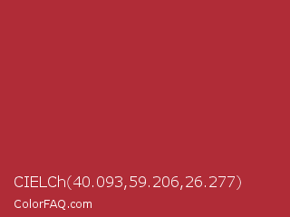 CIELCh 40.093,59.206,26.277 Color is a normal red color and the nearest color is Well Read #b43332. Hex code #b02c37 and RGB value is rgb(176,44,55). In RGB color space, this color is composed of 69% red, 17% green, 22% blue, In CMYK color space, this color is composed of 0% cyan, 75% magenta, 69% yellow , 31% black , In HSL color space, this color has a hue angle of 355° , 60% saturation and 43% lightness.