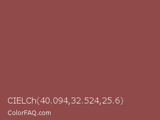 CIELCh 40.094,32.524,25.6 Color is a normal red color and the nearest color is Copper Rust #944747. Hex code #904a49 and RGB value is rgb(144,74,73). In RGB color space, this color is composed of 56% red, 29% green, 29% blue, In CMYK color space, this color is composed of 0% cyan, 49% magenta, 49% yellow , 44% black , In HSL color space, this color has a hue angle of 1° , 33% saturation and 43% lightness.