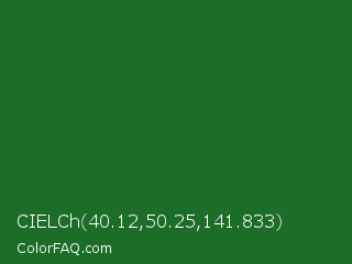 CIELCh 40.12,50.25,141.833 Color is a dark green color and the nearest color is La Salle Green #087830. Hex code #1b6d28 and RGB value is rgb(27,109,40). In RGB color space, this color is composed of 11% red, 43% green, 16% blue, In CMYK color space, this color is composed of 75% cyan, 0% magenta, 63% yellow , 57% black , In HSL color space, this color has a hue angle of 130° , 60% saturation and 27% lightness.
