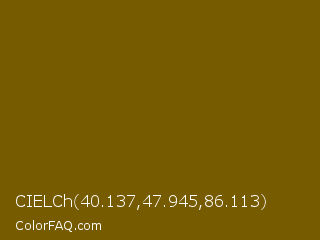 CIELCh 40.137,47.945,86.113 Color is a dark yellow color and the nearest color is Yukon Gold #7b6608. Hex code #765b00 and RGB value is rgb(118,91,0). In RGB color space, this color is composed of 46% red, 36% green, 0% blue, In CMYK color space, this color is composed of 0% cyan, 23% magenta, 100% yellow , 54% black , In HSL color space, this color has a hue angle of 46° , 100% saturation and 23% lightness.