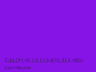 CIELCh 40.13,110.875,313.485 Color is a normal purple color and the nearest color is Blue Violet #8a2be2. Hex code #8713e6 and RGB value is rgb(135,19,230). In RGB color space, this color is composed of 53% red, 7% green, 90% blue, In CMYK color space, this color is composed of 41% cyan, 92% magenta, 0% yellow , 10% black , In HSL color space, this color has a hue angle of 273° , 85% saturation and 49% lightness.