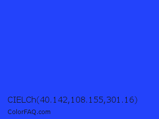 CIELCh 40.142,108.155,301.16 Color is a normal blue color and the nearest color is Palatinate Blue #273be2. Hex code #2343fb and RGB value is rgb(35,67,251). In RGB color space, this color is composed of 14% red, 26% green, 98% blue, In CMYK color space, this color is composed of 86% cyan, 73% magenta, 0% yellow , 2% black , In HSL color space, this color has a hue angle of 231° , 96% saturation and 56% lightness.