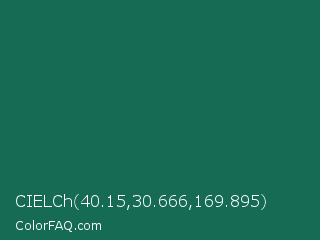 CIELCh 40.15,30.666,169.895 Color is a dark cyan color and the nearest color is Dark Spring Green #177245. Hex code #166b55 and RGB value is rgb(22,107,85). In RGB color space, this color is composed of 9% red, 42% green, 33% blue, In CMYK color space, this color is composed of 79% cyan, 0% magenta, 21% yellow , 58% black , In HSL color space, this color has a hue angle of 164° , 66% saturation and 25% lightness.