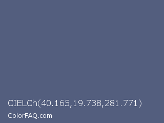 CIELCh 40.165,19.738,281.771 Color is a normal blue color and the nearest color is Paynes Grey #536878. Hex code #535e7e and RGB value is rgb(83,94,126). In RGB color space, this color is composed of 33% red, 37% green, 49% blue, In CMYK color space, this color is composed of 34% cyan, 25% magenta, 0% yellow , 51% black , In HSL color space, this color has a hue angle of 225° , 21% saturation and 41% lightness.