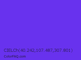CIELCh 40.242,107.487,307.801 Color is a normal indigo color and the nearest color is Majorelle Blue #6050dc. Hex code #6832ee and RGB value is rgb(104,50,238). In RGB color space, this color is composed of 41% red, 20% green, 93% blue, In CMYK color space, this color is composed of 56% cyan, 79% magenta, 0% yellow , 7% black , In HSL color space, this color has a hue angle of 257° , 85% saturation and 56% lightness.