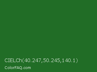 CIELCh 40.247,50.245,140.1 Color is a dark green color and the nearest color is Mughal Green #306030. Hex code #216d26 and RGB value is rgb(33,109,38). In RGB color space, this color is composed of 13% red, 43% green, 15% blue, In CMYK color space, this color is composed of 70% cyan, 0% magenta, 65% yellow , 57% black , In HSL color space, this color has a hue angle of 124° , 54% saturation and 28% lightness.