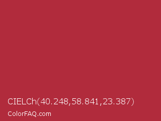 CIELCh 40.248,58.841,23.387 Color is a normal red color and the nearest color is Well Read #b43332. Hex code #b12b3c and RGB value is rgb(177,43,60). In RGB color space, this color is composed of 69% red, 17% green, 24% blue, In CMYK color space, this color is composed of 0% cyan, 76% magenta, 66% yellow , 31% black , In HSL color space, this color has a hue angle of 352° , 61% saturation and 43% lightness.