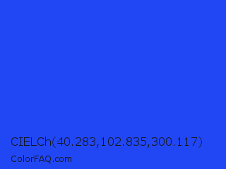 CIELCh 40.283,102.835,300.117 Color is a normal blue color and the nearest color is Palatinate Blue #273be2. Hex code #2147f5 and RGB value is rgb(33,71,245). In RGB color space, this color is composed of 13% red, 28% green, 96% blue, In CMYK color space, this color is composed of 87% cyan, 71% magenta, 0% yellow , 4% black , In HSL color space, this color has a hue angle of 229° , 91% saturation and 55% lightness.