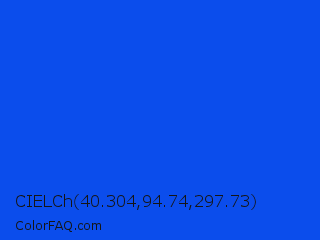 CIELCh 40.304,94.74,297.73 Color is a normal blue color and the nearest color is Blue RYB #0247fe. Hex code #0b4dec and RGB value is rgb(11,77,236). In RGB color space, this color is composed of 4% red, 30% green, 93% blue, In CMYK color space, this color is composed of 95% cyan, 67% magenta, 0% yellow , 7% black , In HSL color space, this color has a hue angle of 222° , 91% saturation and 48% lightness.