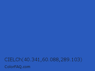 CIELCh 40.341,60.088,289.103 Color is a normal blue color and the nearest color is Cerulean Blue #2a52be. Hex code #295abd and RGB value is rgb(41,90,189). In RGB color space, this color is composed of 16% red, 35% green, 74% blue, In CMYK color space, this color is composed of 78% cyan, 52% magenta, 0% yellow , 26% black , In HSL color space, this color has a hue angle of 220° , 64% saturation and 45% lightness.