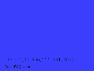 CIELCh 40.356,111.231,303 Color is a light blue color and the nearest color is Palatinate Blue #273be2. Hex code #3b3efd and RGB value is rgb(59,62,253). In RGB color space, this color is composed of 23% red, 24% green, 99% blue, In CMYK color space, this color is composed of 77% cyan, 75% magenta, 0% yellow , 1% black , In HSL color space, this color has a hue angle of 239° , 98% saturation and 61% lightness.