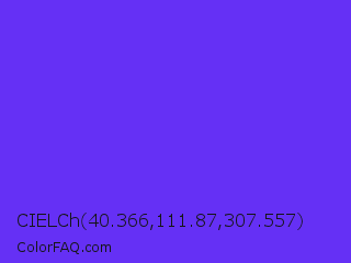 CIELCh 40.366,111.87,307.557 Color is a normal indigo color and the nearest color is Han Purple #5218fa. Hex code #6530f5 and RGB value is rgb(101,48,245). In RGB color space, this color is composed of 40% red, 19% green, 96% blue, In CMYK color space, this color is composed of 59% cyan, 80% magenta, 0% yellow , 4% black , In HSL color space, this color has a hue angle of 256° , 91% saturation and 57% lightness.