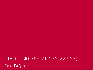 CIELCh 40.366,71.575,22.953 Color is a normal rose color and the nearest color is Crimson Glory #be0032. Hex code #c00036 and RGB value is rgb(192,0,54). In RGB color space, this color is composed of 75% red, 0% green, 21% blue, In CMYK color space, this color is composed of 0% cyan, 100% magenta, 72% yellow , 25% black , In HSL color space, this color has a hue angle of 343° , 100% saturation and 38% lightness.