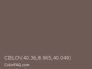 CIELCh 40.36,8.965,40.049 Color is a normal red color and the nearest color is Pine Cone #6d5e54. Hex code #6e5b56 and RGB value is rgb(110,91,86). In RGB color space, this color is composed of 43% red, 36% green, 34% blue, In CMYK color space, this color is composed of 0% cyan, 17% magenta, 22% yellow , 57% black , In HSL color space, this color has a hue angle of 13° , 12% saturation and 38% lightness.