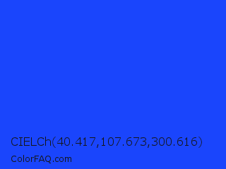 CIELCh 40.417,107.673,300.616 Color is a normal blue color and the nearest color is Blue RYB #0247fe. Hex code #1a45fc and RGB value is rgb(26,69,252). In RGB color space, this color is composed of 10% red, 27% green, 99% blue, In CMYK color space, this color is composed of 90% cyan, 73% magenta, 0% yellow , 1% black , In HSL color space, this color has a hue angle of 229° , 97% saturation and 55% lightness.