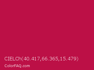 CIELCh 40.417,66.365,15.479 Color is a normal rose color and the nearest color is Pictorial Carmine #c30b4e. Hex code #bc1046 and RGB value is rgb(188,16,70). In RGB color space, this color is composed of 74% red, 6% green, 27% blue, In CMYK color space, this color is composed of 0% cyan, 91% magenta, 63% yellow , 26% black , In HSL color space, this color has a hue angle of 341° , 84% saturation and 40% lightness.