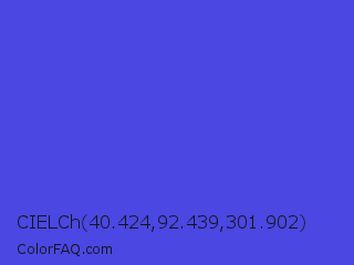 CIELCh 40.424,92.439,301.902 Color is a normal indigo color and the nearest color is Majorelle Blue #6050dc. Hex code #4a47e3 and RGB value is rgb(74,71,227). In RGB color space, this color is composed of 29% red, 28% green, 89% blue, In CMYK color space, this color is composed of 67% cyan, 69% magenta, 0% yellow , 11% black , In HSL color space, this color has a hue angle of 241° , 74% saturation and 58% lightness.