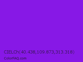 CIELCh 40.438,109.873,313.318 Color is a normal purple color and the nearest color is Blue Violet #8a2be2. Hex code #8718e6 and RGB value is rgb(135,24,230). In RGB color space, this color is composed of 53% red, 9% green, 90% blue, In CMYK color space, this color is composed of 41% cyan, 90% magenta, 0% yellow , 10% black , In HSL color space, this color has a hue angle of 272° , 81% saturation and 50% lightness.