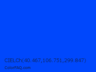CIELCh 40.467,106.751,299.847 Color is a normal blue color and the nearest color is Blue RYB #0247fe. Hex code #0047fc and RGB value is rgb(0,71,252). In RGB color space, this color is composed of 0% red, 28% green, 99% blue, In CMYK color space, this color is composed of 100% cyan, 72% magenta, 0% yellow , 1% black , In HSL color space, this color has a hue angle of 223° , 100% saturation and 49% lightness.