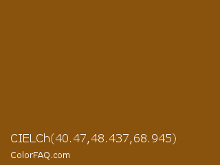 CIELCh 40.47,48.437,68.945 Color is a dark orange color and the nearest color is Rusty Nail #86560a. Hex code #89530e and RGB value is rgb(137,83,14). In RGB color space, this color is composed of 54% red, 33% green, 5% blue, In CMYK color space, this color is composed of 0% cyan, 39% magenta, 90% yellow , 46% black , In HSL color space, this color has a hue angle of 34° , 81% saturation and 30% lightness.