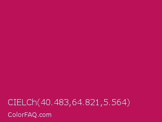 CIELCh 40.483,64.821,5.564 Color is a normal rose color and the nearest color is Pictorial Carmine #c30b4e. Hex code #ba1158 and RGB value is rgb(186,17,88). In RGB color space, this color is composed of 73% red, 7% green, 35% blue, In CMYK color space, this color is composed of 0% cyan, 91% magenta, 53% yellow , 27% black , In HSL color space, this color has a hue angle of 335° , 83% saturation and 40% lightness.