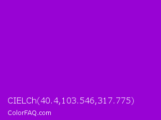 CIELCh 40.4,103.546,317.775 Color is a normal purple color and the nearest color is Dark Violet #9400d3. Hex code #9803d4 and RGB value is rgb(152,3,212). In RGB color space, this color is composed of 60% red, 1% green, 83% blue, In CMYK color space, this color is composed of 28% cyan, 99% magenta, 0% yellow , 17% black , In HSL color space, this color has a hue angle of 283° , 97% saturation and 42% lightness.