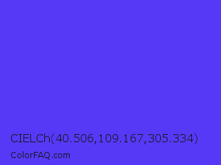 CIELCh 40.506,109.167,305.334 Color is a normal indigo color and the nearest color is Han Purple #5218fa. Hex code #5639f6 and RGB value is rgb(86,57,246). In RGB color space, this color is composed of 34% red, 22% green, 96% blue, In CMYK color space, this color is composed of 65% cyan, 77% magenta, 0% yellow , 4% black , In HSL color space, this color has a hue angle of 249° , 91% saturation and 59% lightness.