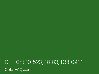 CIELCh 40.523,48.83,138.091 Color is a dark green color and the nearest color is Mughal Green #306030. Hex code #2a6d26 and RGB value is rgb(42,109,38). In RGB color space, this color is composed of 16% red, 43% green, 15% blue, In CMYK color space, this color is composed of 61% cyan, 0% magenta, 65% yellow , 57% black , In HSL color space, this color has a hue angle of 117° , 48% saturation and 29% lightness.