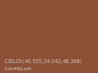 CIELCh 40.555,34.042,48.368 Color is a normal orange color and the nearest color is Potters Clay #8c5738. Hex code #8c5037 and RGB value is rgb(140,80,55). In RGB color space, this color is composed of 55% red, 31% green, 22% blue, In CMYK color space, this color is composed of 0% cyan, 43% magenta, 61% yellow , 45% black , In HSL color space, this color has a hue angle of 18° , 44% saturation and 38% lightness.