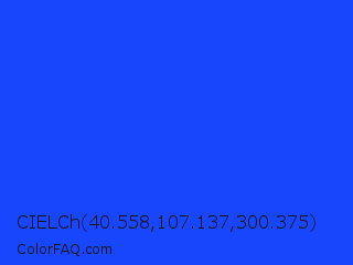CIELCh 40.558,107.137,300.375 Color is a normal blue color and the nearest color is Blue RYB #0247fe. Hex code #1746fc and RGB value is rgb(23,70,252). In RGB color space, this color is composed of 9% red, 27% green, 99% blue, In CMYK color space, this color is composed of 91% cyan, 72% magenta, 0% yellow , 1% black , In HSL color space, this color has a hue angle of 228° , 97% saturation and 54% lightness.