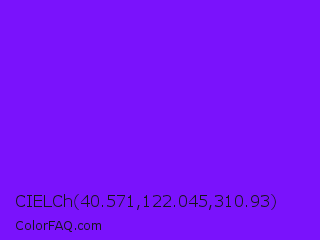 CIELCh 40.571,122.045,310.93 Color is a normal violet color and the nearest color is Violet Color Wheel #7f00ff. Hex code #7a12fc and RGB value is rgb(122,18,252). In RGB color space, this color is composed of 48% red, 7% green, 99% blue, In CMYK color space, this color is composed of 52% cyan, 93% magenta, 0% yellow , 1% black , In HSL color space, this color has a hue angle of 267° , 98% saturation and 53% lightness.