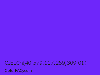 CIELCh 40.579,117.259,309.01 Color is a normal indigo color and the nearest color is Han Purple #5218fa. Hex code #6e26fa and RGB value is rgb(110,38,250). In RGB color space, this color is composed of 43% red, 15% green, 98% blue, In CMYK color space, this color is composed of 56% cyan, 85% magenta, 0% yellow , 2% black , In HSL color space, this color has a hue angle of 260° , 95% saturation and 56% lightness.