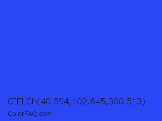 CIELCh 40.594,102.645,300.513 Color is a normal blue color and the nearest color is Palatinate Blue #273be2. Hex code #2b47f5 and RGB value is rgb(43,71,245). In RGB color space, this color is composed of 17% red, 28% green, 96% blue, In CMYK color space, this color is composed of 82% cyan, 71% magenta, 0% yellow , 4% black , In HSL color space, this color has a hue angle of 232° , 91% saturation and 56% lightness.