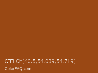 CIELCh 40.5,54.039,54.719 Color is a normal orange color and the nearest color is Korma #8f4b0e. Hex code #9a4814 and RGB value is rgb(154,72,20). In RGB color space, this color is composed of 60% red, 28% green, 8% blue, In CMYK color space, this color is composed of 0% cyan, 53% magenta, 87% yellow , 40% black , In HSL color space, this color has a hue angle of 23° , 77% saturation and 34% lightness.