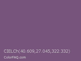 CIELCh 40.609,27.045,322.332 Color is a normal magenta color and the nearest color is Old Lavender #796878. Hex code #76547b and RGB value is rgb(118,84,123). In RGB color space, this color is composed of 46% red, 33% green, 48% blue, In CMYK color space, this color is composed of 4% cyan, 32% magenta, 0% yellow , 52% black , In HSL color space, this color has a hue angle of 292° , 19% saturation and 41% lightness.