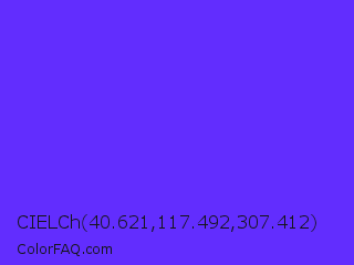 CIELCh 40.621,117.492,307.412 Color is a normal indigo color and the nearest color is Han Purple #5218fa. Hex code #622dfe and RGB value is rgb(98,45,254). In RGB color space, this color is composed of 38% red, 18% green, 100% blue, In CMYK color space, this color is composed of 61% cyan, 82% magenta, 0% yellow , 0% black , In HSL color space, this color has a hue angle of 255° , 99% saturation and 59% lightness.