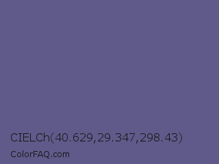 CIELCh 40.629,29.347,298.43 Color is a normal indigo color and the nearest color is Butterfly Bush #624e9a. Hex code #605a8a and RGB value is rgb(96,90,138). In RGB color space, this color is composed of 38% red, 35% green, 54% blue, In CMYK color space, this color is composed of 30% cyan, 35% magenta, 0% yellow , 46% black , In HSL color space, this color has a hue angle of 248° , 21% saturation and 45% lightness.