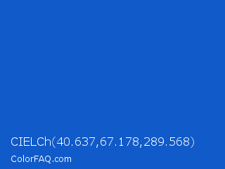 CIELCh 40.637,67.178,289.568 Color is a normal blue color and the nearest color is Denim #1560bd. Hex code #105ac9 and RGB value is rgb(16,90,201). In RGB color space, this color is composed of 6% red, 35% green, 79% blue, In CMYK color space, this color is composed of 92% cyan, 55% magenta, 0% yellow , 21% black , In HSL color space, this color has a hue angle of 216° , 85% saturation and 43% lightness.