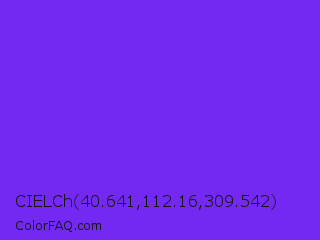CIELCh 40.641,112.16,309.542 Color is a normal violet color and the nearest color is Blue Violet #8a2be2. Hex code #7329f2 and RGB value is rgb(115,41,242). In RGB color space, this color is composed of 45% red, 16% green, 95% blue, In CMYK color space, this color is composed of 52% cyan, 83% magenta, 0% yellow , 5% black , In HSL color space, this color has a hue angle of 262° , 89% saturation and 55% lightness.