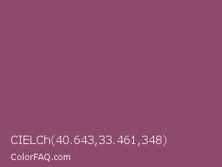 CIELCh 40.643,33.461,348 Color is a normal rose color and the nearest color is Twilight Lavender #8a496b. Hex code #8d4a6c and RGB value is rgb(141,74,108). In RGB color space, this color is composed of 55% red, 29% green, 42% blue, In CMYK color space, this color is composed of 0% cyan, 48% magenta, 23% yellow , 45% black , In HSL color space, this color has a hue angle of 330° , 31% saturation and 42% lightness.