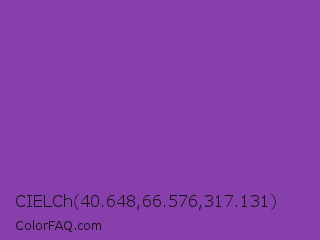 CIELCh 40.648,66.576,317.131 Color is a normal purple color and the nearest color is Royal Purple #7851a9. Hex code #873fab and RGB value is rgb(135,63,171). In RGB color space, this color is composed of 53% red, 25% green, 67% blue, In CMYK color space, this color is composed of 21% cyan, 63% magenta, 0% yellow , 33% black , In HSL color space, this color has a hue angle of 280° , 46% saturation and 46% lightness.