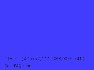 CIELCh 40.657,111.983,303.541 Color is a light indigo color and the nearest color is Palatinate Blue #273be2. Hex code #423dfe and RGB value is rgb(66,61,254). In RGB color space, this color is composed of 26% red, 24% green, 100% blue, In CMYK color space, this color is composed of 74% cyan, 76% magenta, 0% yellow , 0% black , In HSL color space, this color has a hue angle of 242° , 99% saturation and 62% lightness.