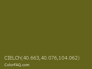 CIELCh 40.663,40.076,104.062 Color is a dark yellow color and the nearest color is Antique Bronze #665d1e. Hex code #63631b and RGB value is rgb(99,99,27). In RGB color space, this color is composed of 39% red, 39% green, 11% blue, In CMYK color space, this color is composed of 0% cyan, 0% magenta, 73% yellow , 61% black , In HSL color space, this color has a hue angle of 60° , 57% saturation and 25% lightness.