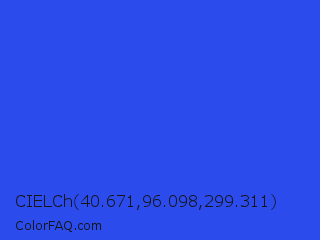 CIELCh 40.671,96.098,299.311 Color is a normal blue color and the nearest color is Palatinate Blue #273be2. Hex code #2b4bed and RGB value is rgb(43,75,237). In RGB color space, this color is composed of 17% red, 29% green, 93% blue, In CMYK color space, this color is composed of 82% cyan, 68% magenta, 0% yellow , 7% black , In HSL color space, this color has a hue angle of 230° , 84% saturation and 55% lightness.