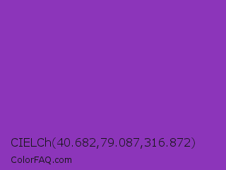 CIELCh 40.682,79.087,316.872 Color is a normal purple color and the nearest color is Dark Orchid #9932cc. Hex code #8c35ba and RGB value is rgb(140,53,186). In RGB color space, this color is composed of 55% red, 21% green, 73% blue, In CMYK color space, this color is composed of 25% cyan, 72% magenta, 0% yellow , 27% black , In HSL color space, this color has a hue angle of 279° , 56% saturation and 47% lightness.