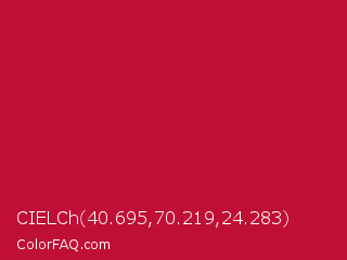 CIELCh 40.695,70.219,24.283 Color is a normal red color and the nearest color is Red NCS #c40233. Hex code #bf0f35 and RGB value is rgb(191,15,53). In RGB color space, this color is composed of 75% red, 6% green, 21% blue, In CMYK color space, this color is composed of 0% cyan, 92% magenta, 72% yellow , 25% black , In HSL color space, this color has a hue angle of 347° , 85% saturation and 40% lightness.
