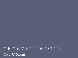 CIELCh 40.6,14.106,283.14 Color is a normal blue color and the nearest color is Comet #5c5d75. Hex code #595f76 and RGB value is rgb(89,95,118). In RGB color space, this color is composed of 35% red, 37% green, 46% blue, In CMYK color space, this color is composed of 25% cyan, 19% magenta, 0% yellow , 54% black , In HSL color space, this color has a hue angle of 228° , 14% saturation and 41% lightness.