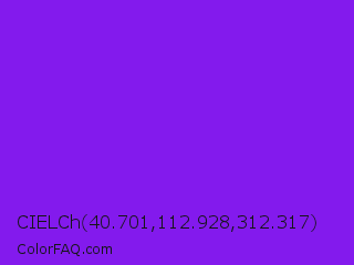 CIELCh 40.701,112.928,312.317 Color is a normal violet color and the nearest color is Blue Violet #8a2be2. Hex code #831aed and RGB value is rgb(131,26,237). In RGB color space, this color is composed of 51% red, 10% green, 93% blue, In CMYK color space, this color is composed of 45% cyan, 89% magenta, 0% yellow , 7% black , In HSL color space, this color has a hue angle of 270° , 85% saturation and 52% lightness.